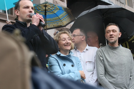"Мы требуем немедленно назначить выборы Киевсовета и мэра. А нынешние депутаты Киевсовета должны сдать мандаты - они сегодня закончились", - заявил активист Алексей Герман.