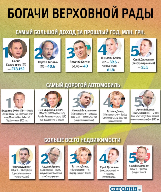 ОППОЗИЦИОНЕРЫ. В открытом доступе есть декларации всех ударовцев и свободовцев. Еще 33-х документов нардепов из «Батькивщины» до сих пор не хватает. Они так же, как и регионалы и коммунисты, говорят, что все подали вовремя. Исходя из того, что есть, богаче всех (доход за 2012-й — 40 млн грн) оказался Виталий Кличко. Правда, по количеству недвижимого имущества он существенно уступает Арсению Яценюку и Татьяне Донец. К слову, у нее и самое дорогое авто (Bentley Continental GTC 2007 г. за $150 тыс.). По доходу среди женщин-депутатов лидирует Ирина Луценко (22,4 млн грн). А вот по количеству недвижимого имущества ударовцы на первом месте. У Ярослава Дубневича и его семьи — 18 квартир и восемь домов. Немало среди оппозиционеров и тех, кто не владеет никаким имуществом: это пять ударовцев и четыре из «Батькивщины». Самыми «бедными» в Объединенной оппозиции оказались свободовцы. Совокупный доход всех 36 членов фракции — 24 млн грн. При этом больше всех заработал не Олег Тягнибок (202,3 тыс. грн), а Александр Мирный (16,9 млн грн). Причем трое свободовцев не имеют собственного жилья. Беднее всех оказался Юрий Сиротюк. За год ему удалось заработать лишь 27,9 тыс. грн (но народным депутатом он стал только в декабре, до этого был пресс-секретарем ВО «Свобода»). По сравнению с 2011-м ему удалось приумножить свой доход почти на 14 тыс. грн.