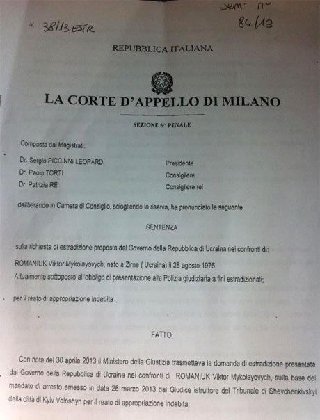 Италия отказалась выдавать Украине беглого Виктора Романюка (ДОКУМЕНТ)