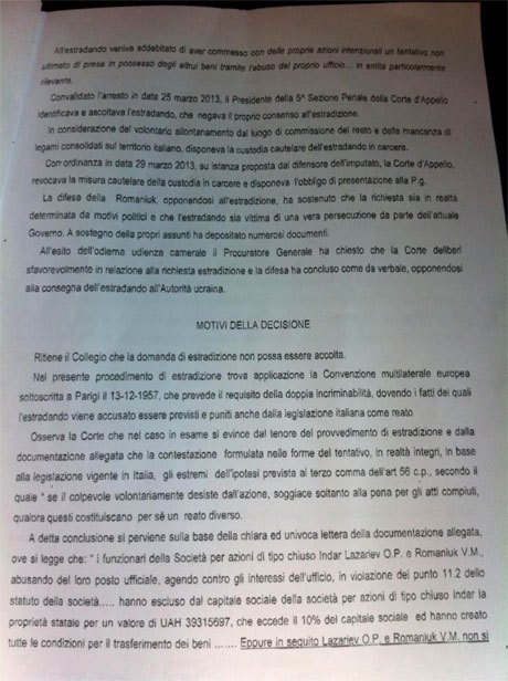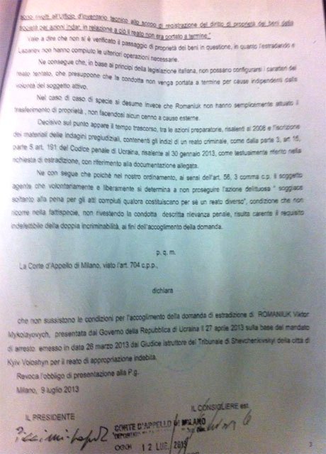 Как отмечается на сайте Романюка, итальянская сторона не увидела состава преступления в его действиях, чем "фактически доказала политическую мотивированность преследования" экс-кандидата в народные депутаты.