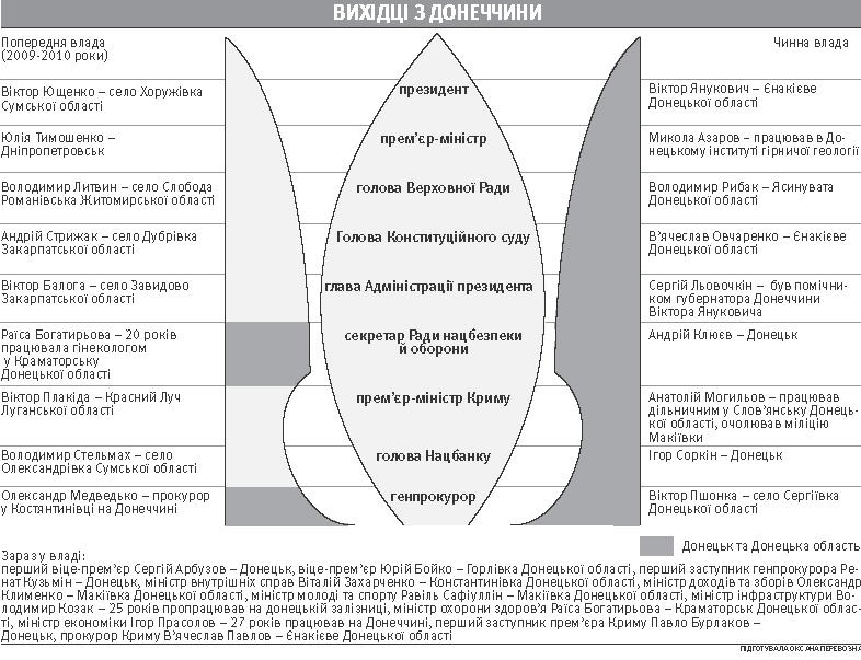 — За время независимости во власти никогда не было сконцентрировано столько людей из одного региона, как сейчас, — говорит политолог 60-летний Виктор Небоженко. — Чтобы окончательно развалить Советский Союз в Украине, нужно было разрушить плановую систему. Это блестяще сделали Кравчук и Кучма за счет формирования олигархического способа управления. Молодым людям передавали целые куски промышленности. Так появились олигархи. Они никого не боялись. Могли через коррупцию или звонок из Администрации президента уничтожить кого угодно. Теперь пришла "семья", окруженная большим количеством донецких исполнителей, боевиков и слуг. Они уничтожают олигархов, чтобы занять их место. Здесь не профессионализм и опыт, а личная преданность — основа всего.