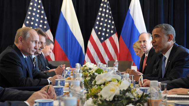 Президент России сообщил, что с они с Обамой решили, что главы МИД обеих стран Сергей Лавров и Джон Керри в ближайшее время "войдут в контакт и еще раз обсудят эту тему".