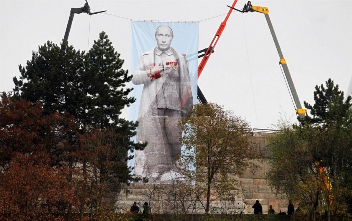 В пятницу, 25 октября, в столице Чехии Праге, где сегодня стартуют парламентские выборы, местные активисты вывесили огромный плакат с изображением президента России Владимира Путина в образе советского диктатора Иосифа Сталина.