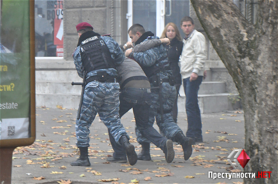 Сотрудники милиции, осуществлявшие охрану общественного порядка во время марша, сразу же задержали двоих «свободовцев», и, заломив им руки за спину, посадили в служебный автомобиль. Из милицейского авто были слышны агрессивные крики милиционеров в сторону задержанных. Тем временем, порядка 50 - 60 участников праздничного шествия «Русского Блока» продолжили движение и остановились митингом возле здания Николаевской облгосадминистрации.