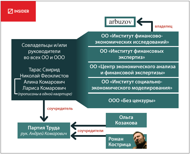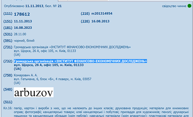 Именно Лариса Комарович по состоянию на конец прошлого года была директором и соучредителем обеих организаций. А другие соучредители организаций - Алина Комарович, Тарас Свирид и Николай Феоклистов - указаны соучредителями и "Института финансово-экономических исследований", на который зарегистрирован знак Arbuzov.