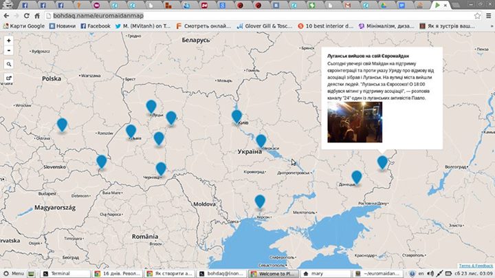 «Создал интерактивную карту Евромайдан со всеми городами, которые принимали участие», - отметил он. И также попросил писать в замечаниях, что упустил.