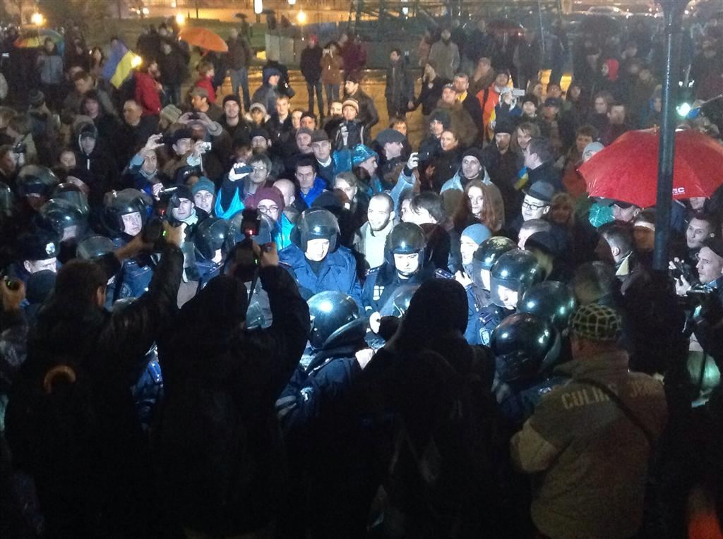 Ночью, после того как было отключено освещение силовики в масках напали на участников митинга. Между активистами с сотрудниками Беркута завязалась драка. Беркутовцы оттеснили митингующих с перекрестка.