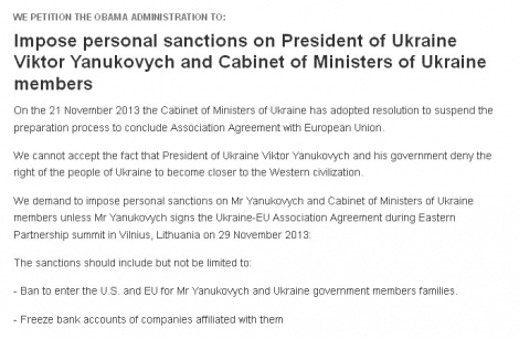 «Мы требуем ввести персональные санкции против г-на Януковича и членов Кабинета министров Украины, если г-н Янукович не подпишет Соглашение об ассоциации Украина-ЕС во время саммита Восточного партнерства в Вильнюсе (Литва) 29 ноября 2013 года», – говорится в петиции.