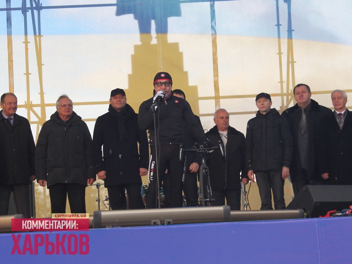 Перед харьковчанами также выступил мэр Харькова Геннадий Кернес. Мэр приехал на митинг в спортивном костюме и с велосипедом. Он заявил, что сегодня проехал 40 км в поддержку курса Президента.
