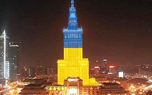 В Варшаве сине-желтым стало самое высокое здание - Дворец культуры и спорта; во Вроцлаве - стадион, где проводили Евро-2012.