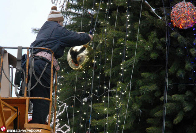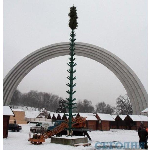 Коммунальные службы Киева установили главную новогоднюю елку столицы под аркой Дружбы народов. Высота елки 14 метров.