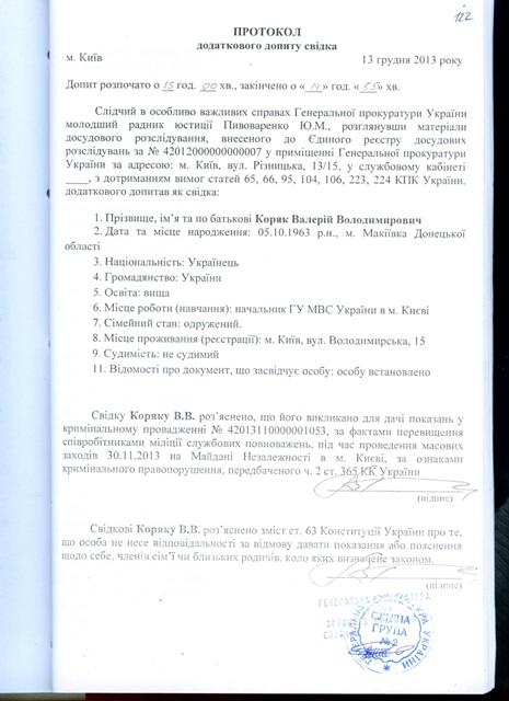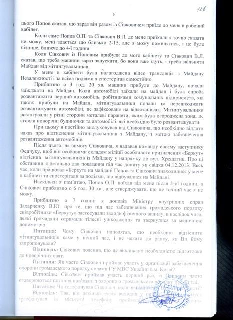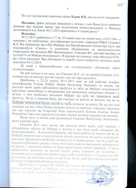 Здесь резуьтаты очной ставки, допрос Валерия Ковша. Он дал показания следствию, что ему позвонил министр внутренних дел Виталий Захарченко и приказал выполнять все команды Сивковича.