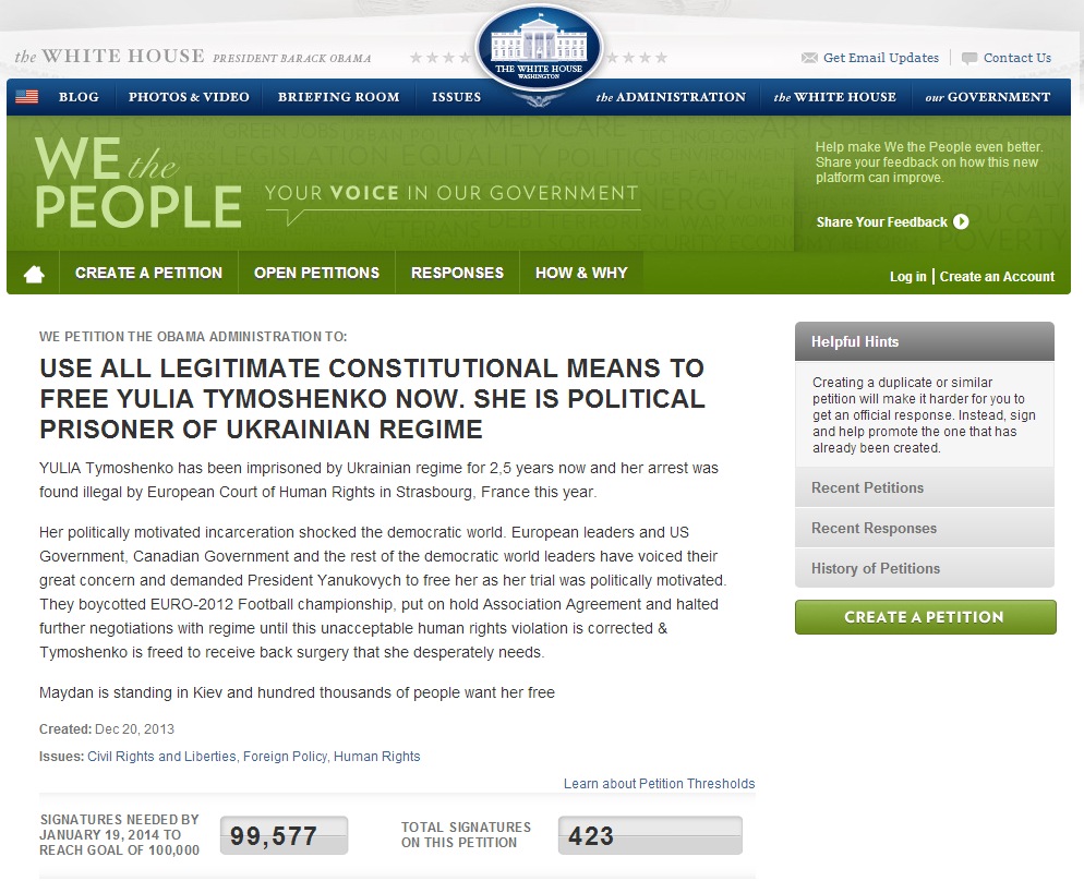 Петиция с требованием к Администрации Президента США Барака Обамы способствовать немедленному освобождению лидера оппозиции Юлии Тимошенко, которая появилась на сайте Белого Дома 21 декабря набрала почти 90 тысяч голосов.