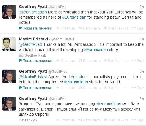 «Согласен с Русланой, что насилие в отношении Евромайдана должно быть осуждено. Диалог и национальный консенсус могут начертить путь в Европу», — отметил он.