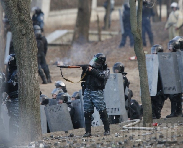 "Беркут" не прибегает к силовым действиям, однако стучит щитами. Из громкоговорителей милиции раздаются призывы не подходить ближе трех метров.