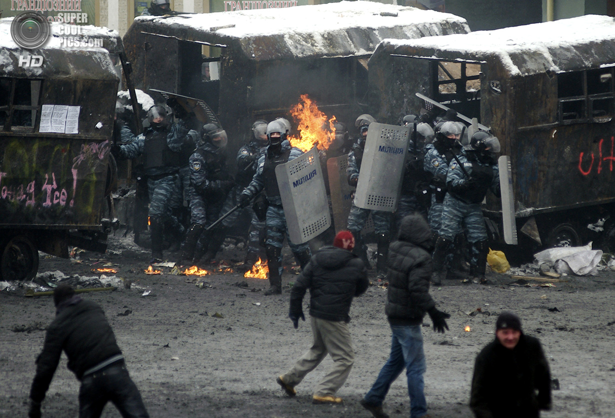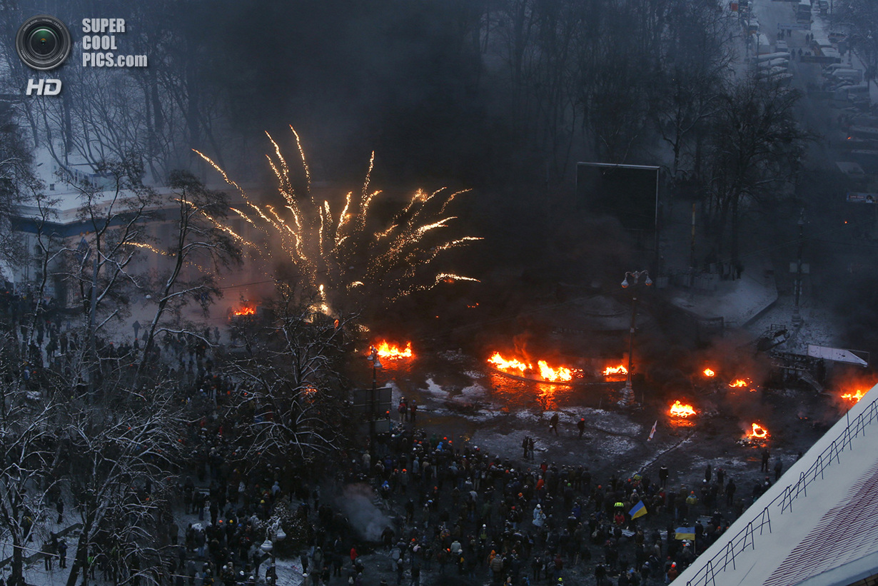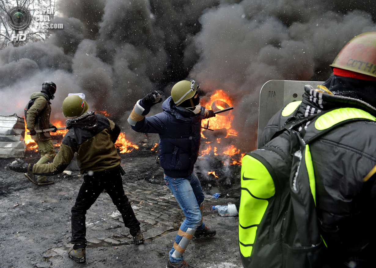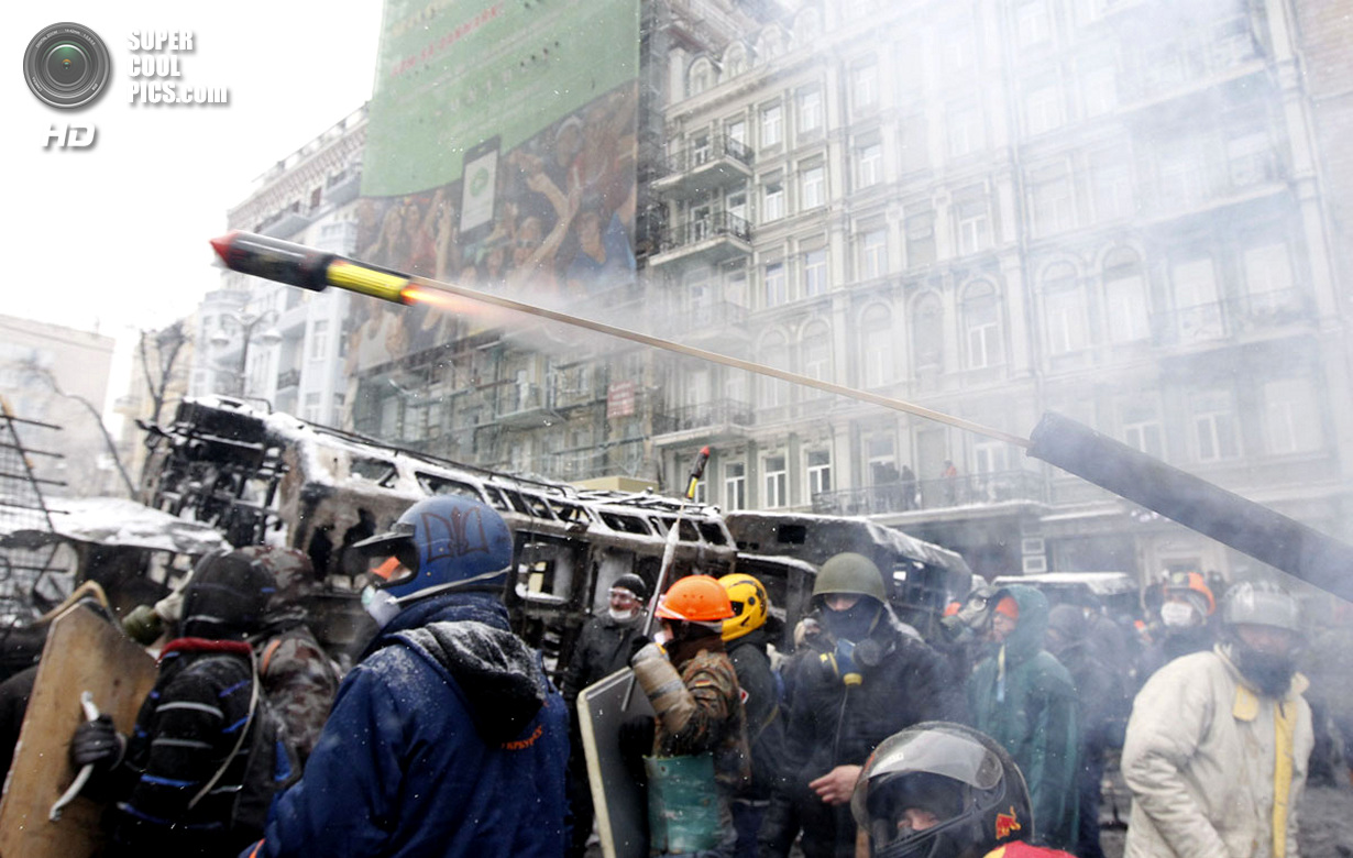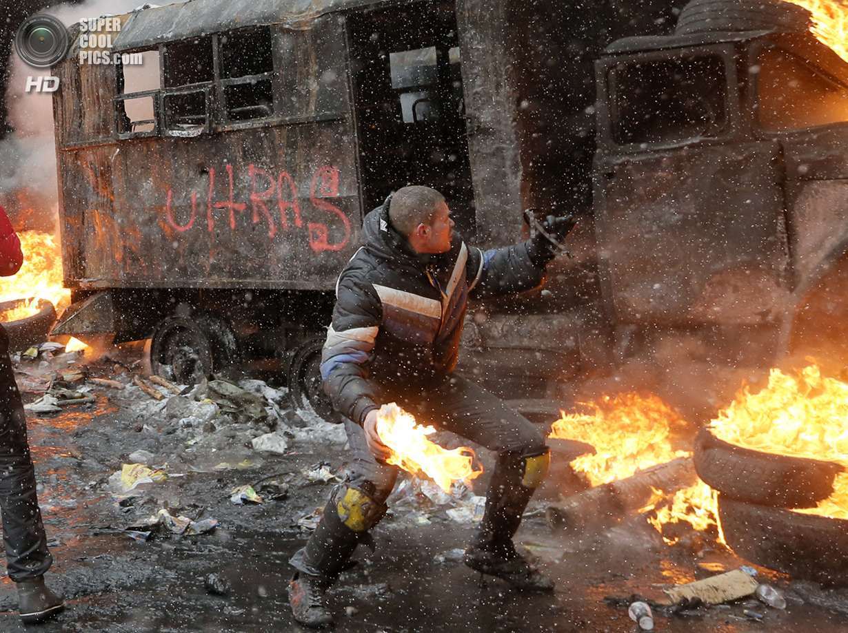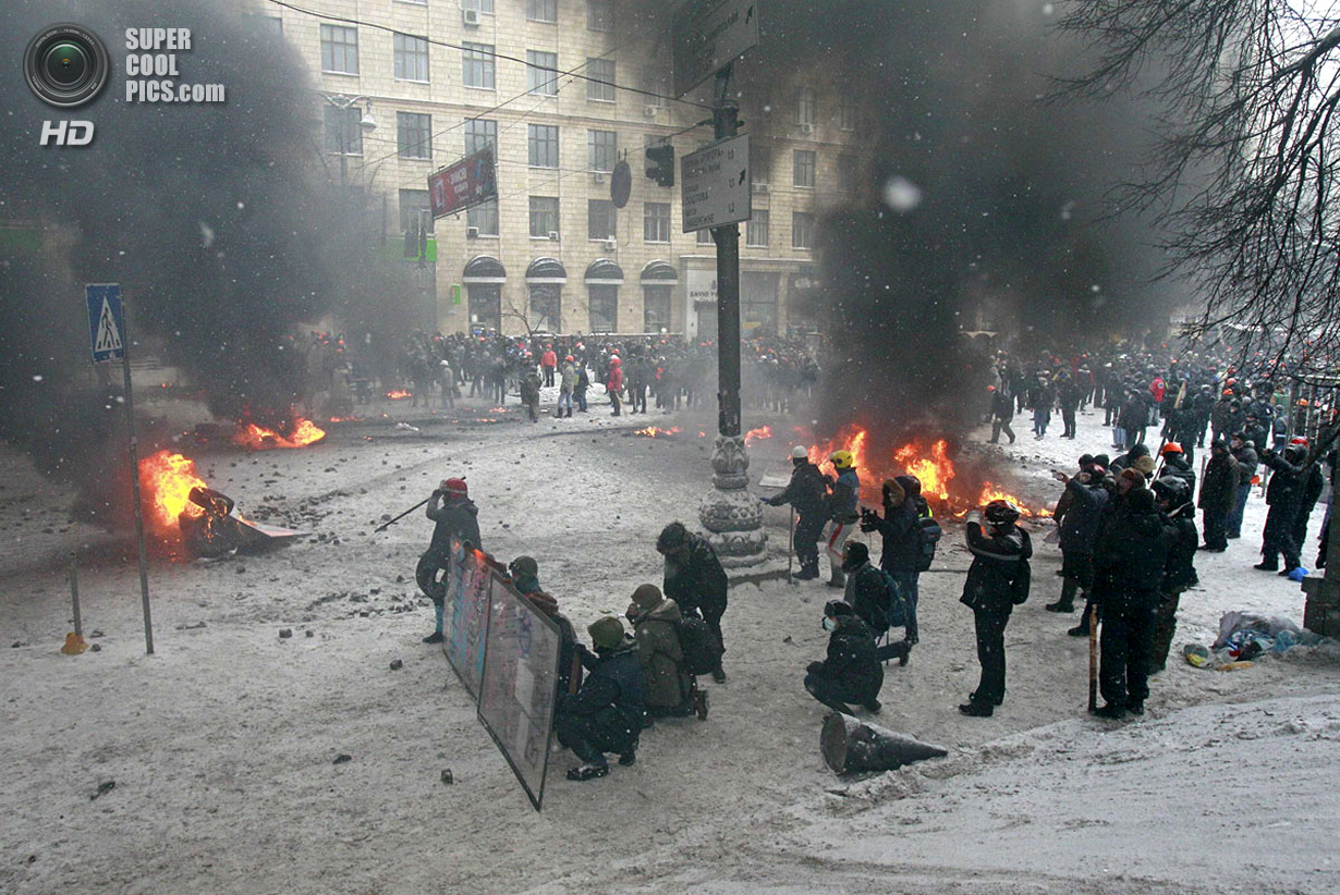 Киев. Украина. 22 января 2014 года. Если изначально в планах собравшихся в центре Киева был мирный протест, то сейчас ситуация обострилась до предела - появились первые жертвы.