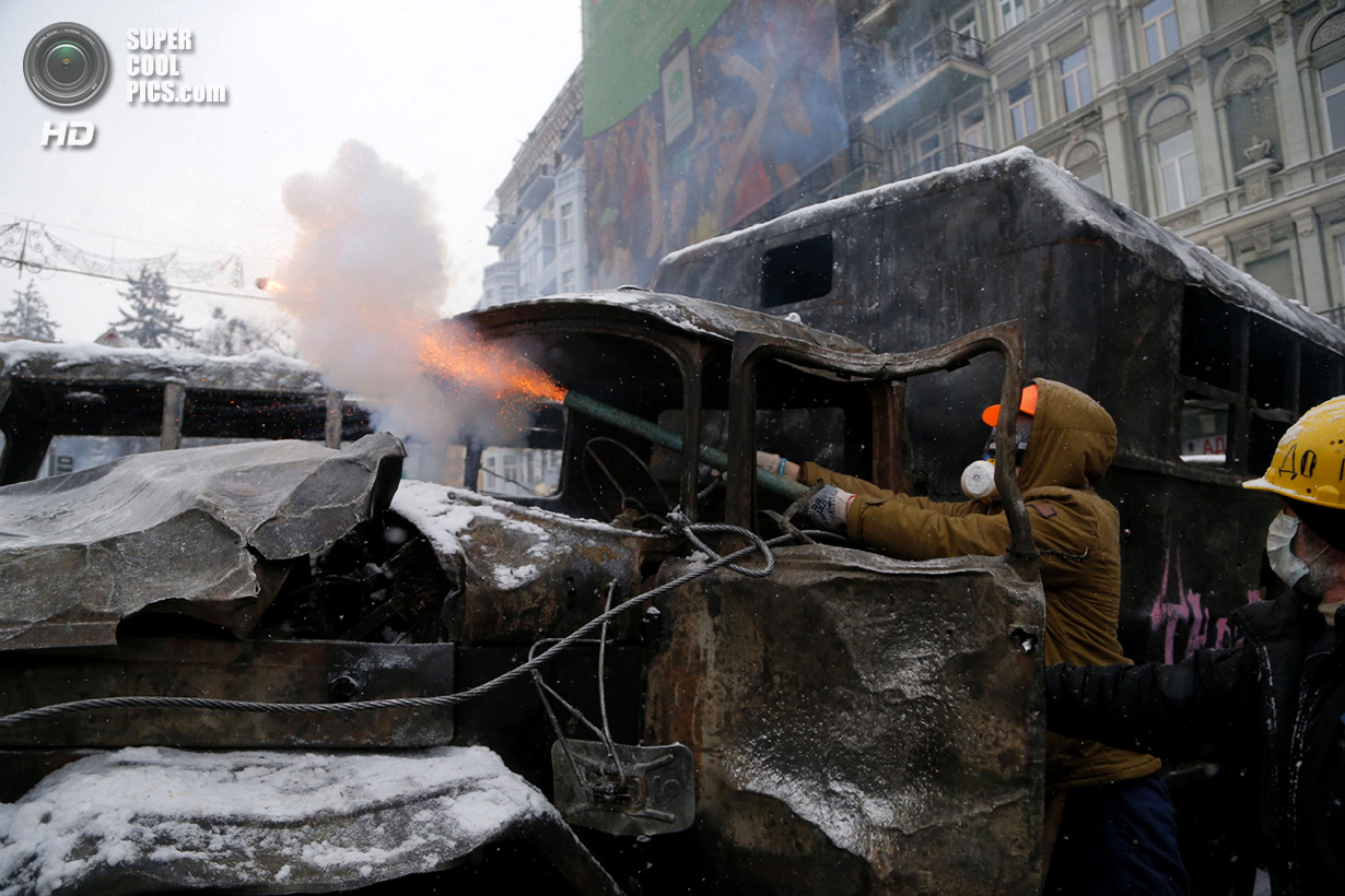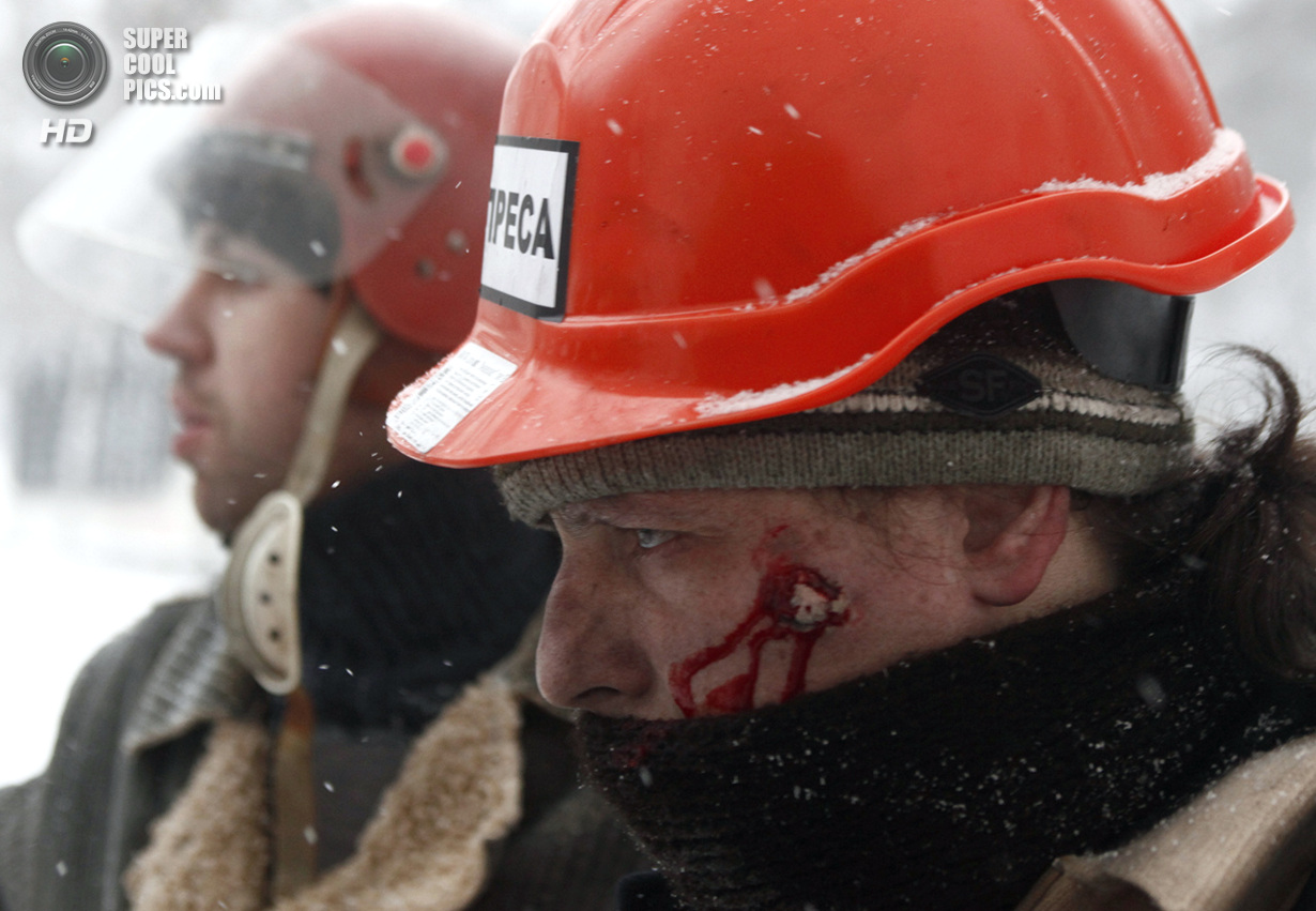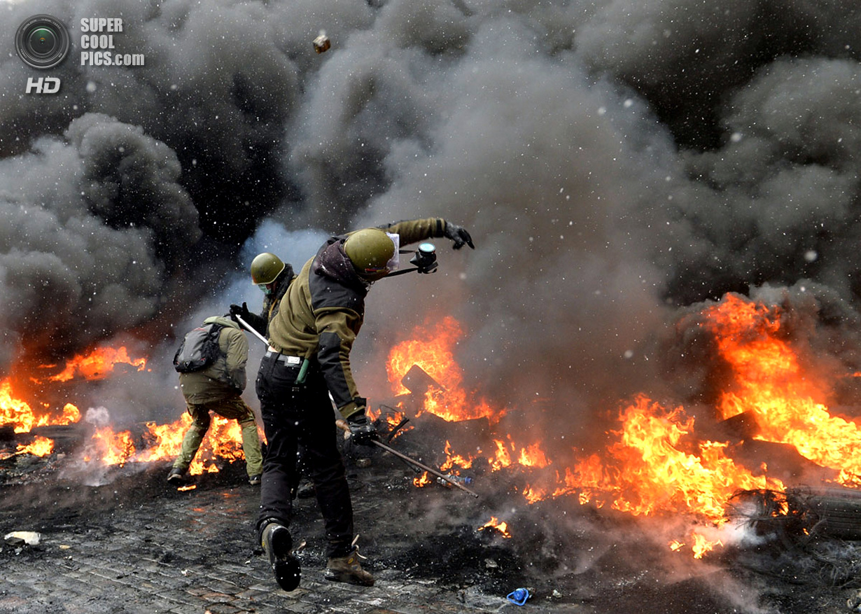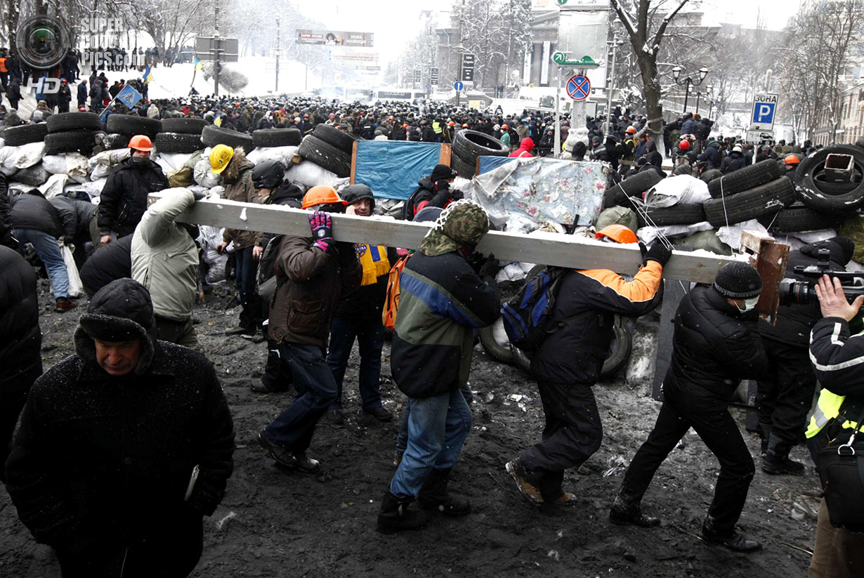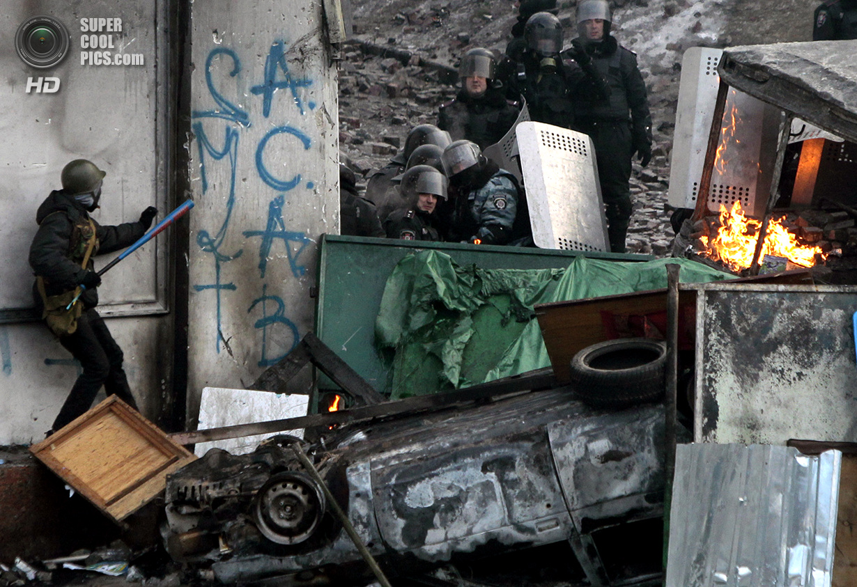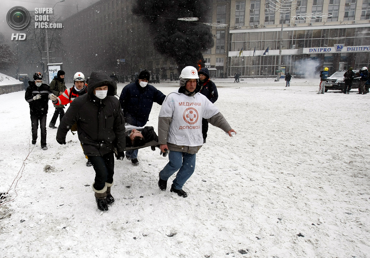 Киев. Украина. 22 января 2014 года. Если изначально в планах собравшихся в центре Киева был мирный протест, то сейчас ситуация обострилась до предела - появились первые жертвы.