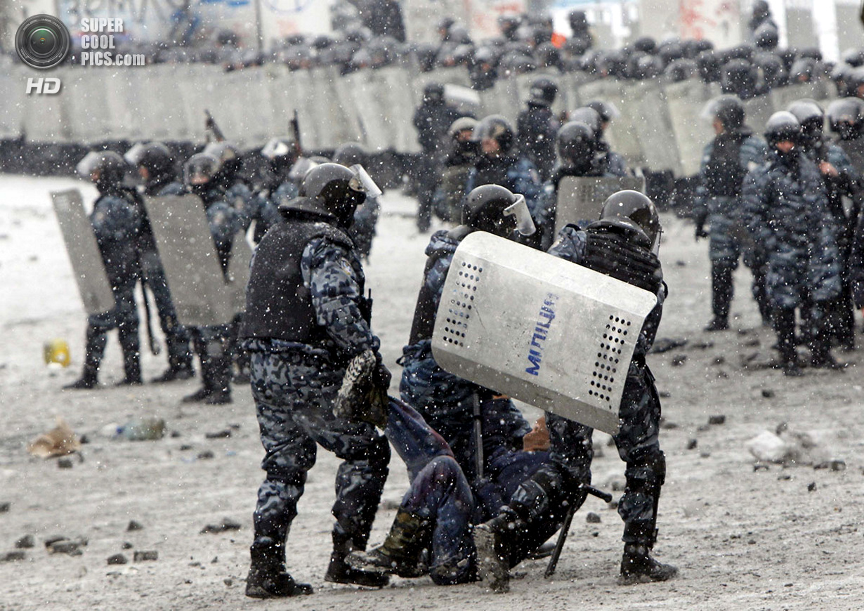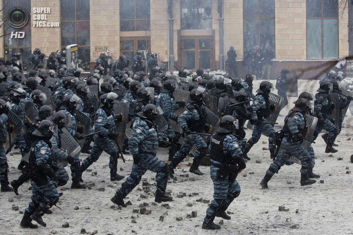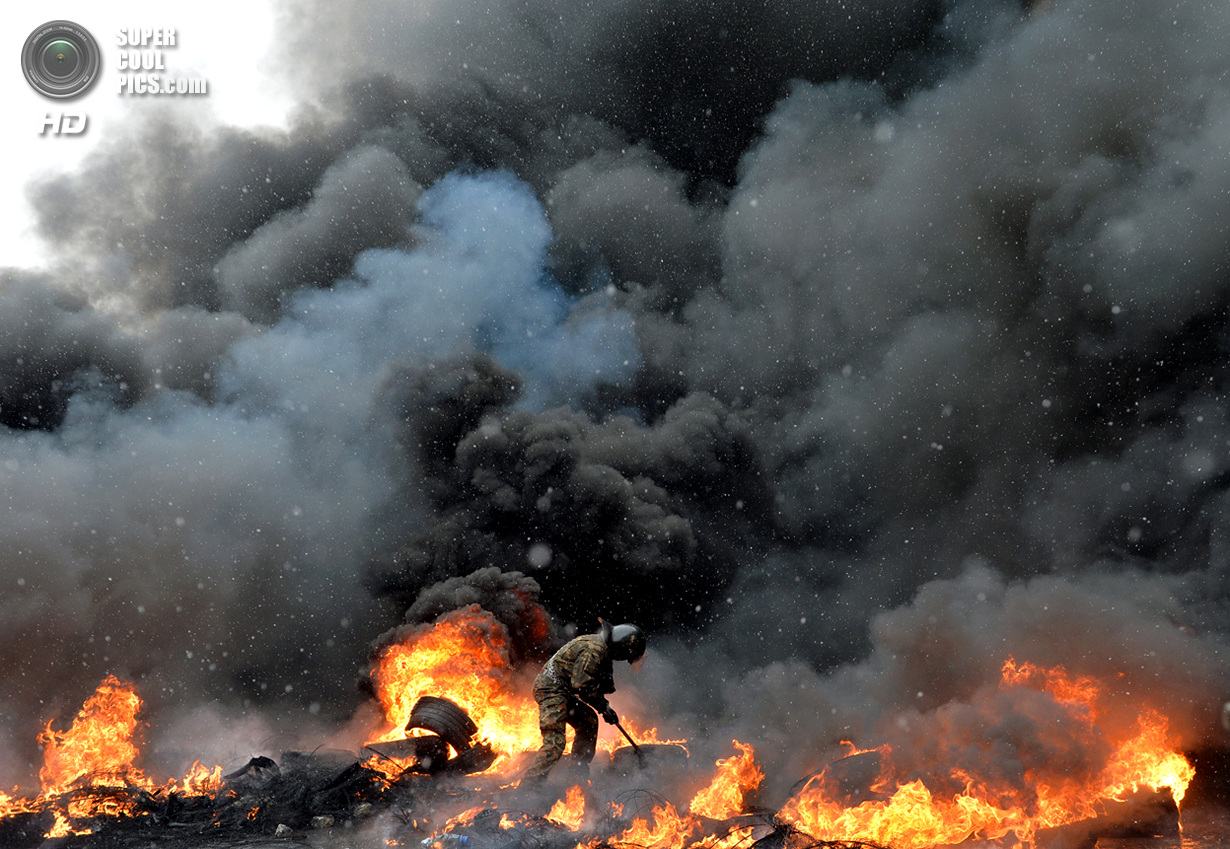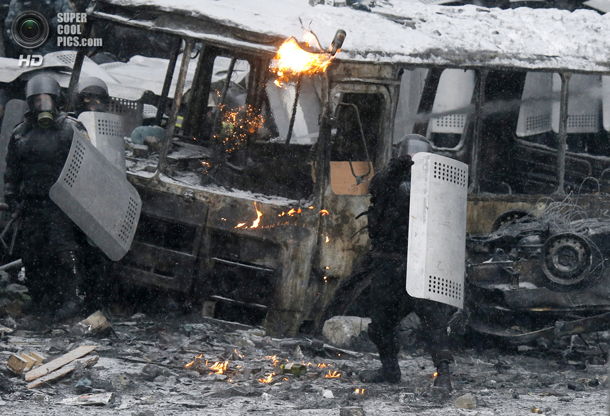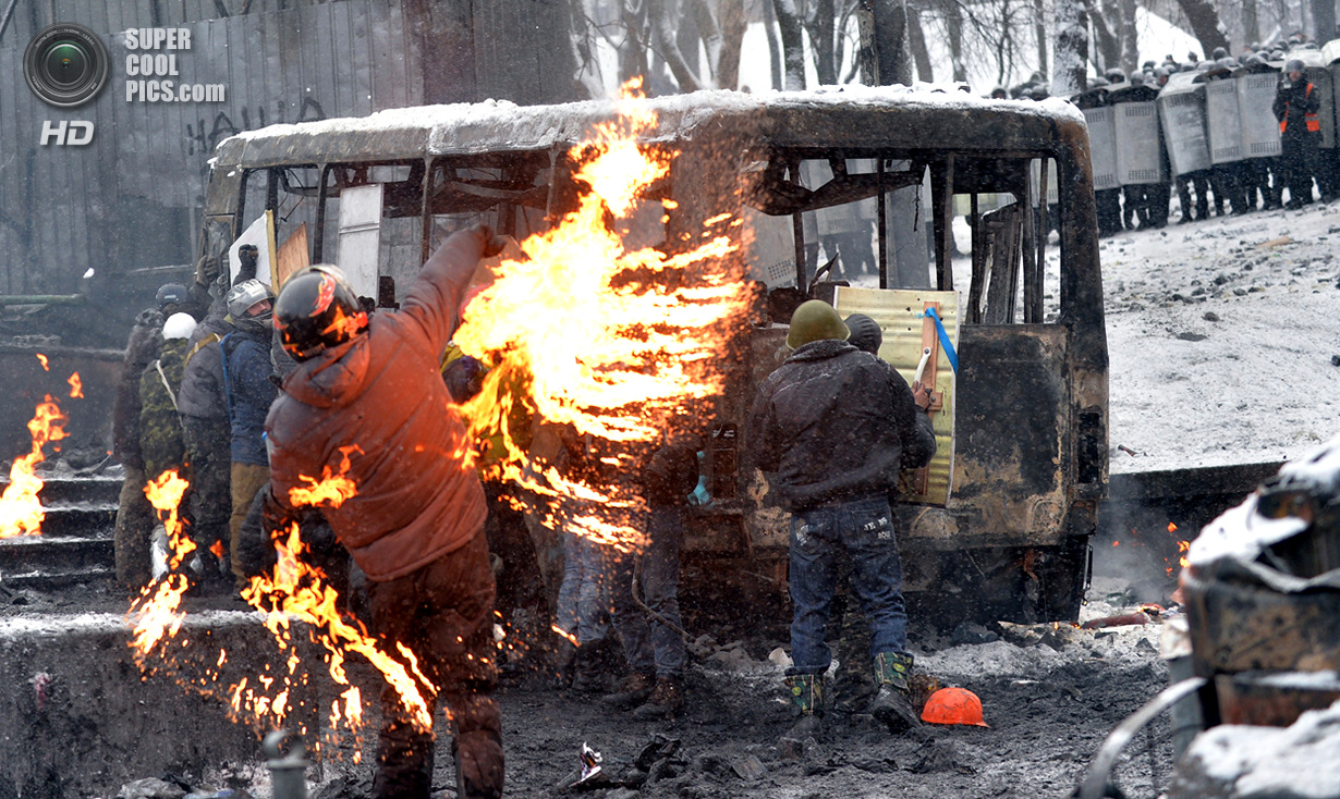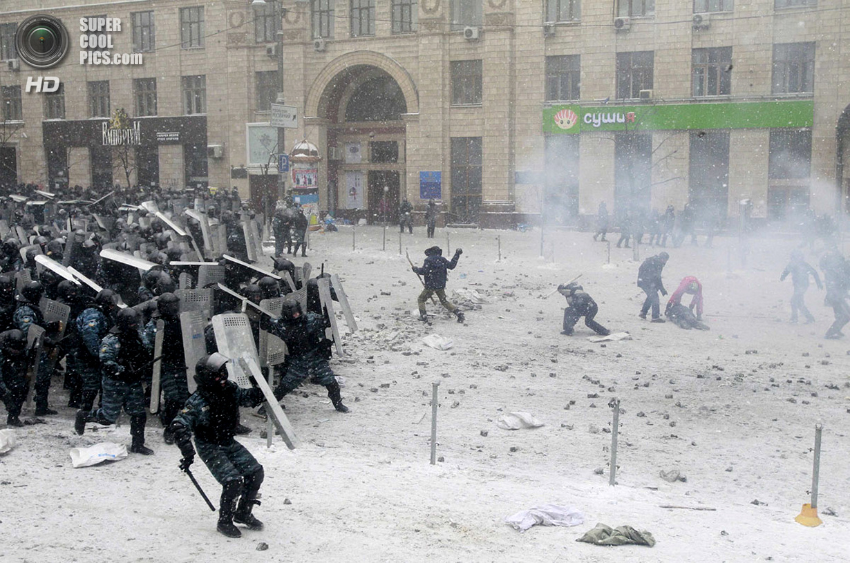Киев. Украина. 22 января 2014 года. Если изначально в планах собравшихся в центре Киева был мирный протест, то сейчас ситуация обострилась до предела - появились первые жертвы.