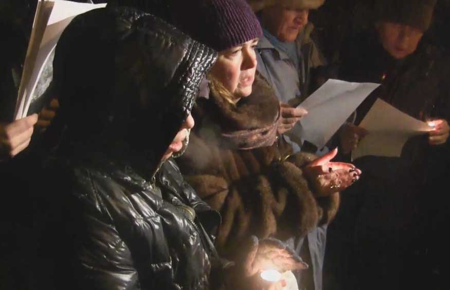 Собравшиеся у здания украинских дипломатов пели гимн Украины, держали в руках плакаты и свечи в знак траура по погибшим активистам Евромайдана.