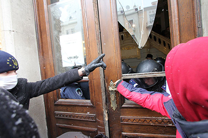 Активисты оттеснили милицейский кордон и разобрали баррикаду, которую установили в помещении сотрудники правоохранительных органов.