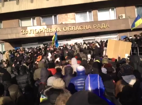 В соцсетях появилось видео воскресного штурма здания облгосадминистрации в Запорожье. Несколько сот человек одновременно ринулись на один из входов ОГА, однако правоохранители сумели выстоять. Силовики применяли светошумовые гранаты, в свою очередь активисты активно бросали бутылки и камни.