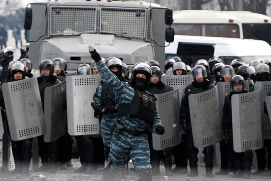 Бойцы спецпоцподразделения «Беркут» воруют автомобильные покрышки, которые принесли киевляне на улицу Грушевского.