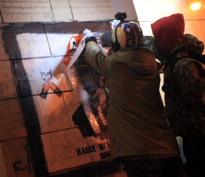 Отмечается, что это уже вторая подобная акция от Sociopath. Две свои первые работы он нарисовал на Майдане Незалежности в декабре.