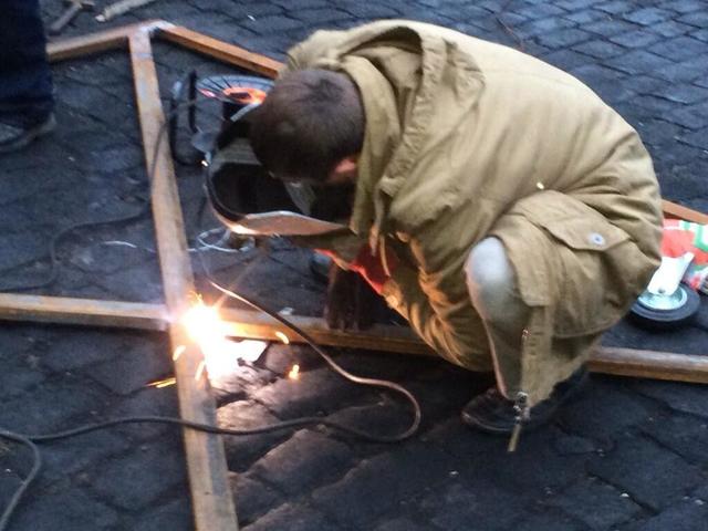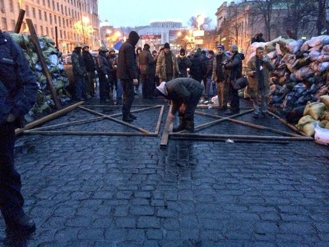 На улице Грушевского активисты смонтировали и установили трехметровые металлические ворота, тем самым завершив установление КПП на месте баррикад.