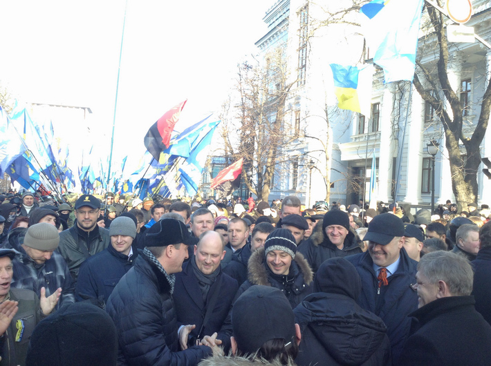 "Украинский народ идет выражать свое мнение с требованием проголосовать сегодня за решения, которые позволят сегодня решить вопросы конституционной реформы... Мы мирно наступаем на парламент, мы блокируем Верховную Раду", - сообщил Тягнибок.
