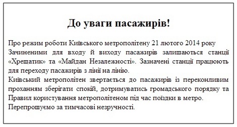 При этом не работали все пересадочные станции ("Крещатик", "Майдан Независимости", "Театральная", "Дворец спорта", "Площадь Льва Толстого", "Золотые Ворота"), а также ст. м. "Арсенальная" и "Почтовая площадь". Кроме того, станция "Вокзальная" работала только на выход.