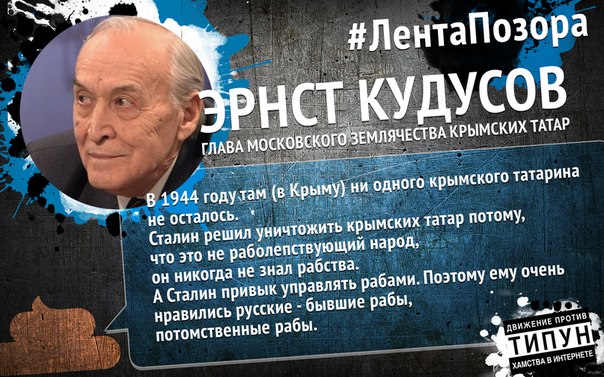 Глава московского землячества крымских татар Эрнст Кудусов публично назвал русских "потомственными рабами". Соответствующее заявление Кудусов сделал в ходе своего выступления в эфире Общественного телевидения России.