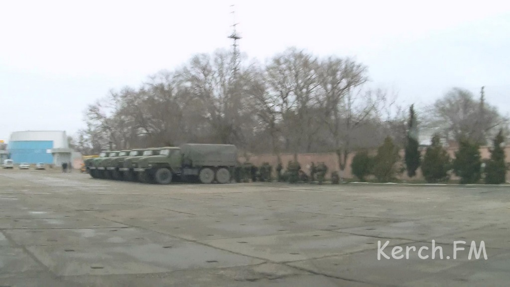 1 марта рядом со зданием морвокзала керченской паромной переправы стоит шесть «Уралов» с российскими номерами. Рядом дежурят несколько десятков военных людей в полной экипировке, с оружием. По словам очевидца (заметно на видео), военные вооружены автоматами Калашникова, винтовками с оптическими прицелами. Также замечен пулемет.