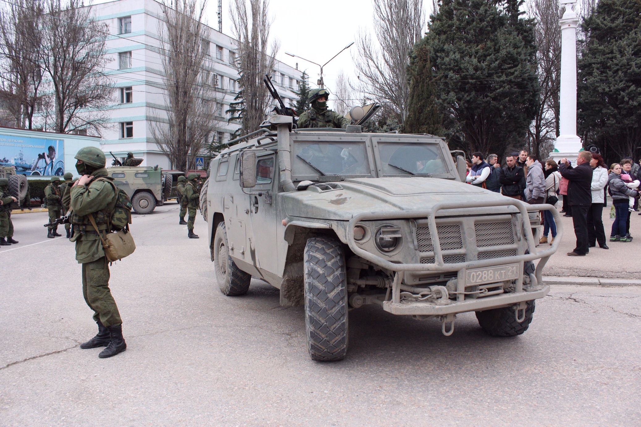 Днем 1 марта российские войска заблокировали морской причал в Балаклаве под Севастополем. На машине указан код 21 - Северо-Кавказский военный округ.