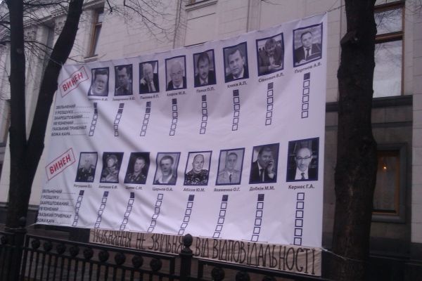 Плакат повесили у входа в здание парламента на улице Грушевского. На нем, в частности, изображены экс-президент в розыске Виктор Янукович, бывший глава Кабмина Николай Азаров, экс-генпрокурор Виктор Пшонка и бывший глава МВД Виталий Захарченко.