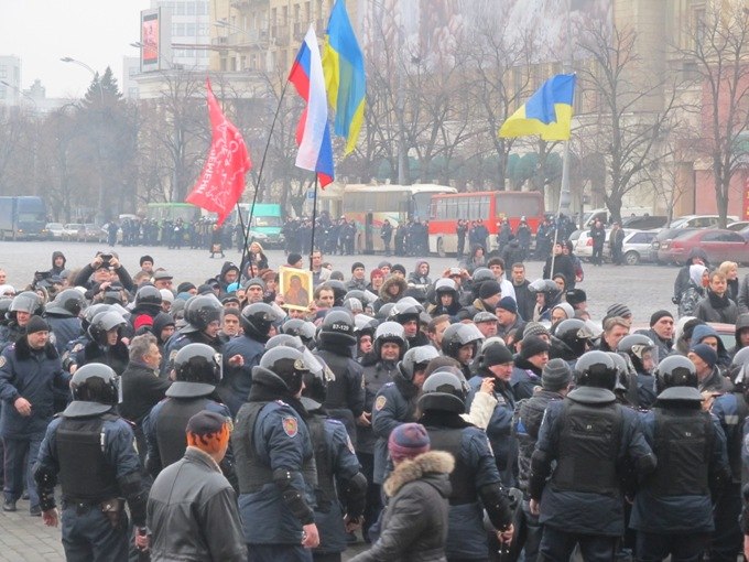 Протестующие с украинским и российскими флагами начали свой митинг в сквере напротив ХНАТОБа. После чего, они пошли к зданию Харьковской облгосадминистрации.