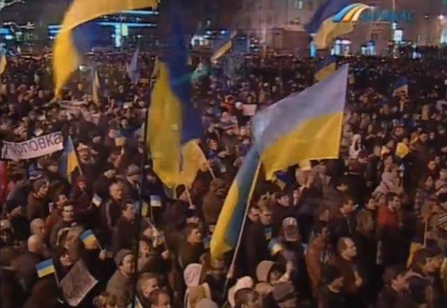Люди на площади скандируют "Слава Україні! Героям слава!". Со сцена выступают небезразличные активисты, все кто выявляет желающие высказаться.