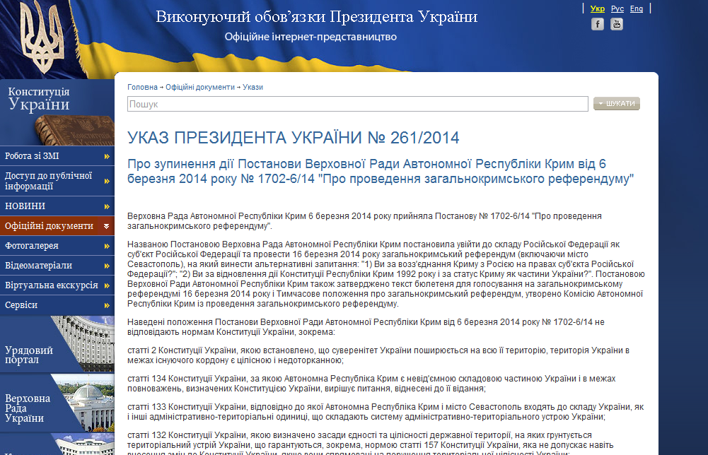 Указ и.о. главы государства Александра Турчинов об остановке действия постановления Верховного Совета Крыма по выходу Республики из состава Украины и назначении референдума обнародован на сайте президента около 13:00 пятницы, 7 марта.
