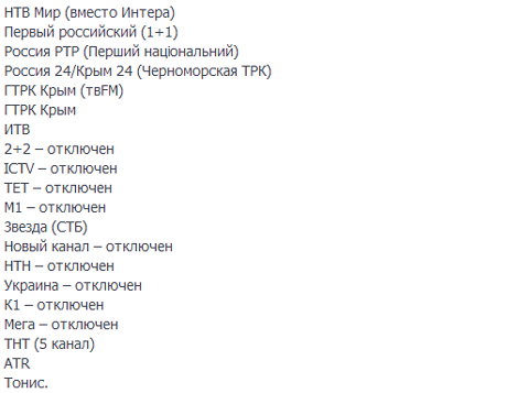 Как сообщил журналист издания "Аргументы недели - Крым" Заир Акадыров, пока из украинских телеканалов остался лишь Тонис.