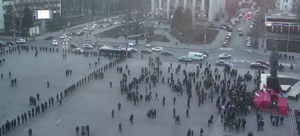 В настоящее время вся площадь Ленина занята пророссийскими активистами. Некоторые из них продолжают преследовать отступающих митингующих. В том числе, они нападают и на тех, кого милиция вывозит с митинга своими автобусами.
