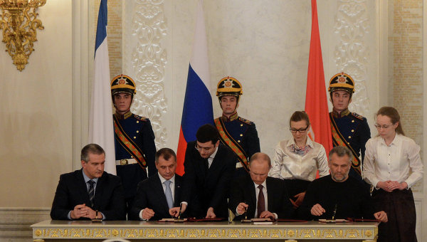 Ранее во вторник в Москве был подписан договор между РФ и Республикой Крым о принятии Крыма в Российскую Федерацию и образовании в составе РФ новых субъектов.