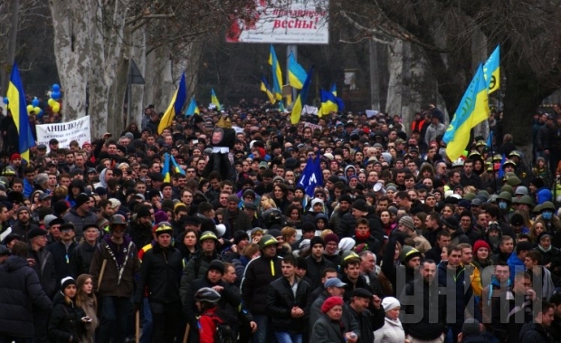 Елена Тарнавская, студентка: "Я вышла на эту акцию, потому что я считаю, что Украина - единая, все области Украины должны быть едиными, объединенными, и я вышла, чтобы поддержать крымчан, большая часть крымчан, мы знаем, за Украину, и они хотят быть украинцами".