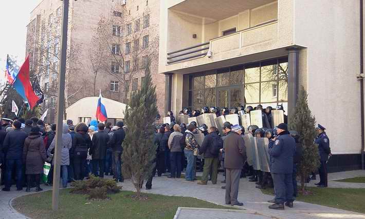 Около 350 участников пророссийского митинга в Донецке пикетируют офис корпорации ИСД, совладельцем которой является председатель Донецкой областной государственной администрации Сергей Тарута.