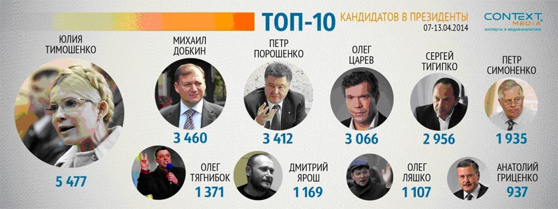 Среди 23 претендентов на высший пост в государстве лидерами по количеству упоминаний в украинских и зарубежных масс-медиа на прошлой неделе стали Юлия Тимошенко (5 477 упоминаний), Михаил Добкин (3 460), Петр Порошенко (3 412), Олег Царев (3 066), Сергей Тигипко (2 956), Петр Симоненко (1 935), Олег Тягнибок (1 371), Дмитрий Ярош (1 169), Олег Ляшко (1 107) и Анатолий Гриценко (937).