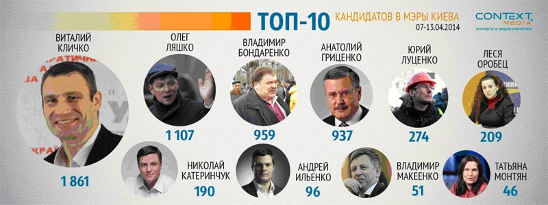 Несмотря на то, что официально избирательная кампания на должность городского главы города Киева начнется через неделю, многие политики уже заявили о своем желании баллотироваться в мэры столицы и стали активно привлекать внимание СМИ. В первую десятку вероятных кандидатов в мэры Киева по количеству упоминаний вошли Виталий Кличко (1 861), Олег Ляшко (1 107), Владимир Бондаренко (959), Анатолий Гриценко (937), Юрий Луценко (274), Леся Оробець (209), Николай Катеринчук (190), Андрей Ильенко (96), Владимир Макеенко (51) и Татьяна Монтян (46).