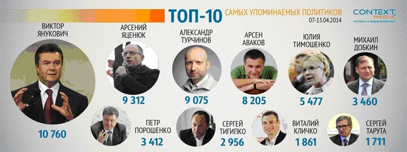 Итоговый список самых упоминаемых украинских политиков возглавили, как и ранее, Виктор Янукович (10 760), Арсений Яценюк (9 312) и Александр Турчинов (9 075). Также в ТОП-10 вошли Арсен Аваков (8 205), Юлия Тимошенко (5 477), Михаил Добкин (3 460), Петр Порошенко (3 412), Сергей Тигипко (2 956), Виталий Кличко (1 861) и Сергей Тарута (1 711).
