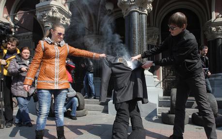 В ходе митинга активисты сожгли чучело главы Национального банка Украины Кубива. Также они пытались поджечь шины, которые принесли с собой. Однако сделать им это так и не удалось - шины не горели.