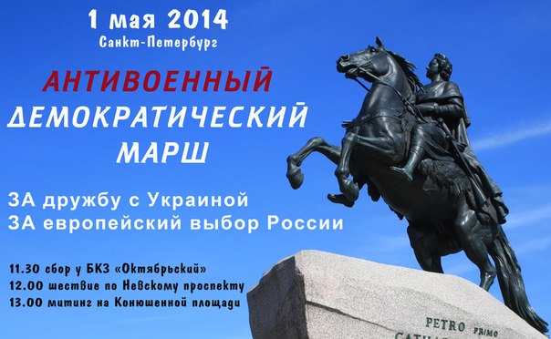 После этого состоится митинг на Марсовом поле. Антивоенный марш пройдет под лозунгом «За дружбу с Украиной и евроинтеграцию России. Нет СССР 2.0!» . Этот лозунг будет написан на центральном баннере колонны. Согласно поданному уведомлению, ожидаемое число участников марша – 1 тыс. человек.