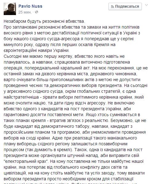 "Сегодня мы имеем первую жертву, убийство которого даже не планировалось, а наоборот, сработала изящно подготовленная операция, предупреждающий карательный акт. По моему убеждению, это не последнее покушение на действующего руководителя города, государственного чиновника, следует ожидать более потрясающих актов с целью не допустить проведения честных и демократических выборов президента. На сегодня у агрессивного восточного соседа, кроме глобальных стратегий, есть одна самая стратегическая - сорвать выборы легитимного руководителя страны, который может возглавить нацию, и дать достойный отпор агрессору. Не исключаю убийство одного из кандидатов на пост президента Украины, чтобы гарантированно достичь поставленной цели. Если кто-то сомневается в таких планах кремля - потерял связь с реальностью. Безусловно, это не будет кандидат от демократического лагеря, наоборот, кандидат с пророссийским планом и программой, чтобы сделать невозможным проведение выборов на востоке страны. Ведь при реализации такого маниакального плана избиратель восточного региона остается вне выборного процесса (так думают в Кремле) . Также, одна из кандидатов на пост президента может организовать искусственное нападение, чтобы исправить свой "электоральный крах". На кону поставлено не только будущее нашей страны, которая страдает от глобального конфликта двух миров и цивилизаций, на кону стоит будущее и успех мероприятия, поэтому считать выбором президента просто необходимым шагом для стабилизации политической ситуации слишком наивно. Выборы президента Украины - это проигрыш стратегии Путина. Если нация выберет президента в первом туре, проигнорировав провокации и возможный резонанс - мы выиграем императора маниакальной империи. Если пойдем другим путем - проиграем не мы, проигрывает демократический мир, а мы просто будем уничтожены как нация, народ, страна, государство", - написал Павел Нусс.