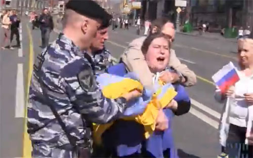 В Москве сотрудники ОМОНа задержали восьмерых активистов, шедших по Тверской улице с флагом Украины. Видеозапись акции, состоявшейся днем в четверг, 1 мая, опубликовало издание «Грани.ру».