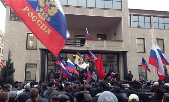 Сторонники самопровозглашённой "Донецкой народной республики" с криками "Россия!" взяли штурмом здание областного управления СБУ.